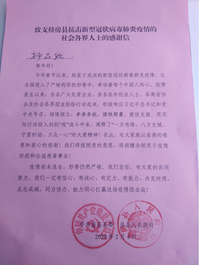 帶著老人的囑托,在縣老干部局工作人員向房縣慈善會說明老人的捐款意圖后,在場的所有人員無不為柯老的家國情懷和大公無私的奉獻精神所感動,房縣慈善會工作人員雙手接過這筆沉甸甸的善款,對老人的善舉表達了深深地謝意,并表示會遵從老人的意愿,第一時間將這筆善款撥付給窯淮鎮界山村委會用于疫情防控,隨后為老人出具了收據及感謝信。