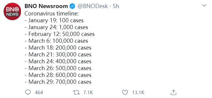 具體時(shí)間線如下:1月19日:超過100例;1月24日:超過1000例;2月12日:超過5萬例;3月6日:超過10萬例;3月18日:超過20萬例;3月21日:超過30萬例;3月24日:超過40萬例;3月26日:超過50萬例;3月28日:超過60萬例;3月29日:超過70萬例。