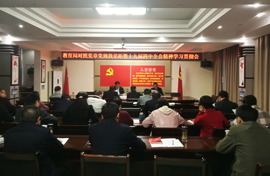 今日房縣網(wǎng)訊 通訊員 徐少輝 報(bào)道:為認(rèn)真學(xué)習(xí)貫徹黨的十九屆四中全會(huì)精神,深入推進(jìn)“不忘初心、牢記使命”主題教育走心走實(shí)。近日,房縣教育局召開對(duì)照黨章黨規(guī)找差距暨十九屆四中全會(huì)精神學(xué)習(xí)貫徹會(huì),會(huì)議由黨組書記周興富主持,縣委主題教育巡回指導(dǎo)組昝開、劉曉曦到會(huì)指導(dǎo)。