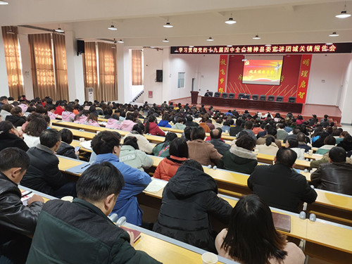 今日房縣網(wǎng)訊? 記者? 孫波? 通訊員 柯勇 報(bào)道:12月10日上午,城關(guān)鎮(zhèn)召開(kāi)學(xué)習(xí)貫徹黨的十九屆四中全會(huì)精神宣講活動(dòng)。縣委宣講團(tuán)成員、漢江師范學(xué)院黨委?宣傳部長(zhǎng)饒軍作宣講報(bào)告。城關(guān)鎮(zhèn)機(jī)關(guān)干部、鎮(zhèn)直部門(mén)和村(社區(qū))近千人參加宣講會(huì)。