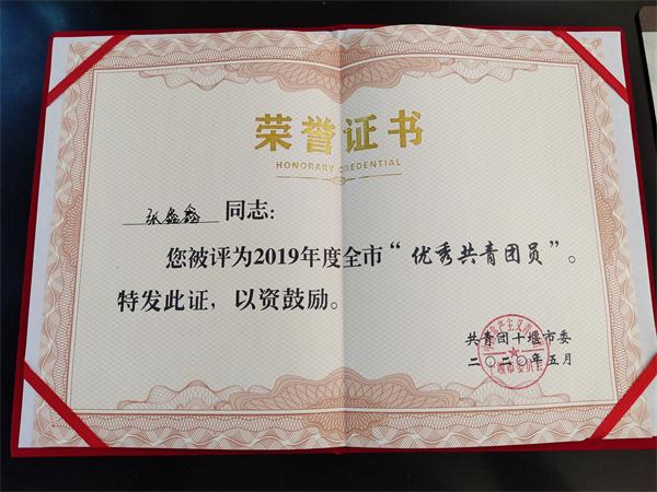 為褒獎他身殘志堅、自強不息的奮斗精神,共青團十堰市委授予張鑫鑫2019年度“優秀共青團員”榮譽稱號。
