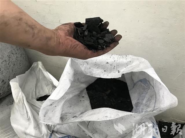 1個(gè)小時(shí)后,記者在一根藍(lán)色管道的最末段看到,一塊塊黑色的炭從管口“出來”,落入下方的塑料袋里。