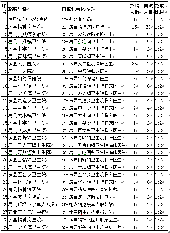根據(jù)《房縣2019年面向社會和隨軍家屬公開招聘事業(yè)單位工作人員公告》,“對面試人數(shù)達(dá)不到1:3的、急需緊缺、邊遠(yuǎn)艱苦崗位,可放寬開考比例到1:2”,經(jīng)縣政府同意,對房縣城市經(jīng)濟(jì)調(diào)查隊(duì)等29個(gè)崗位降低面試比例到1:2。具體如下表: