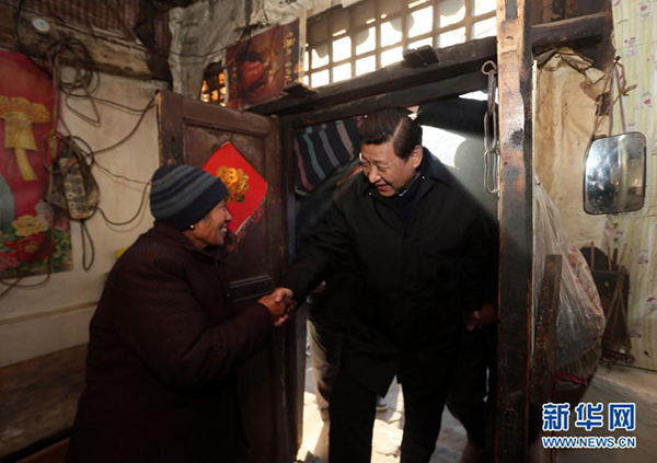 2012年12月29日至30日,習近平在河北省阜平縣看望慰問困難群眾。這是習近平在龍泉關鎮(zhèn)駱駝灣村到困難群眾唐榮斌家看望。新華社記者蘭紅光攝
