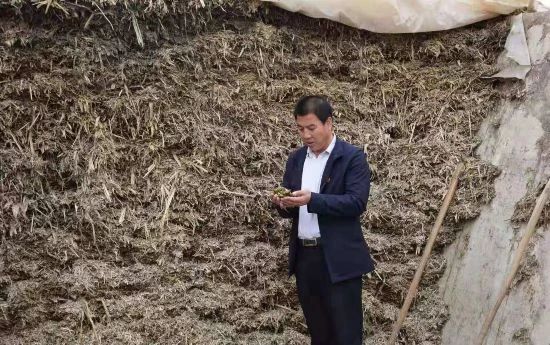 ▲寧夏固原市西吉縣龐灣村第一書記高士平查看青貯池腌草情況。