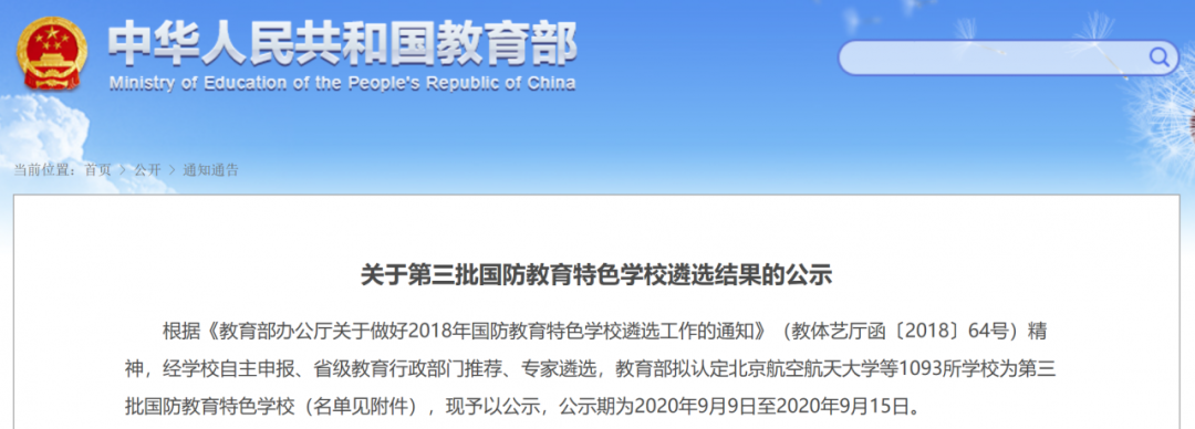 9月9日,教育部國防教育辦公室公示第三批國防教育特色學校遴選結果,經學校自主申報、省級教育行政部門推薦、專家遴選,教育部擬認定1093所學校為第三批國防教育特色學校。其中,湖北有49所高校上榜。