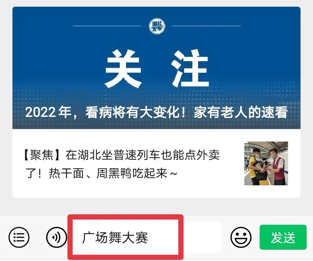 方法二:您也可以在對話框中輸入“廣場舞大賽”“廣場舞”等關鍵詞參與投票。
