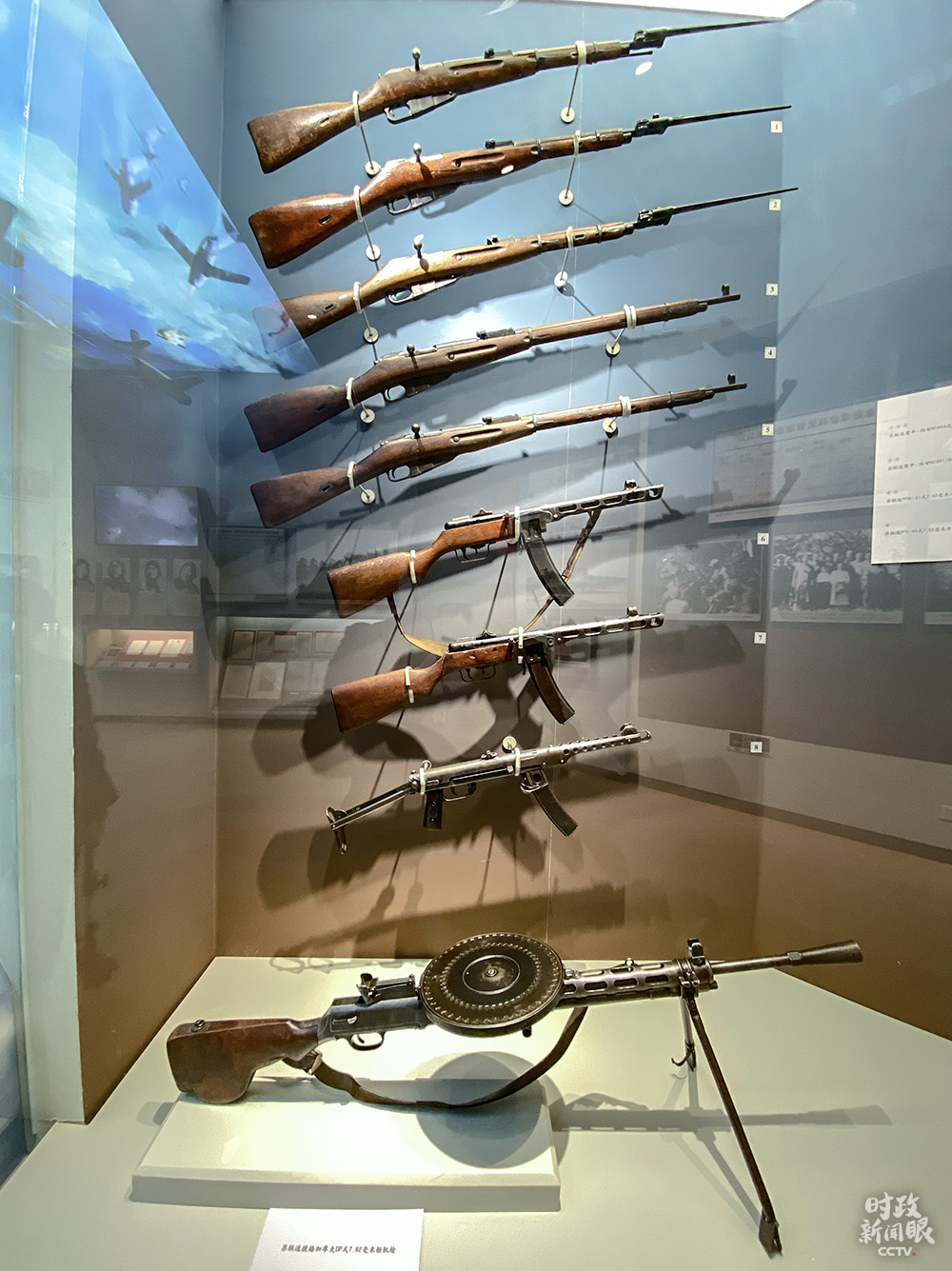 △圖中最下面是捷格加廖夫輕機槍,彈盤裝彈數(shù)量多。抗美援朝戰(zhàn)場上,志愿軍曾使用過這種火力兇猛的蘇式機槍。(總臺央視記者李輝拍攝)