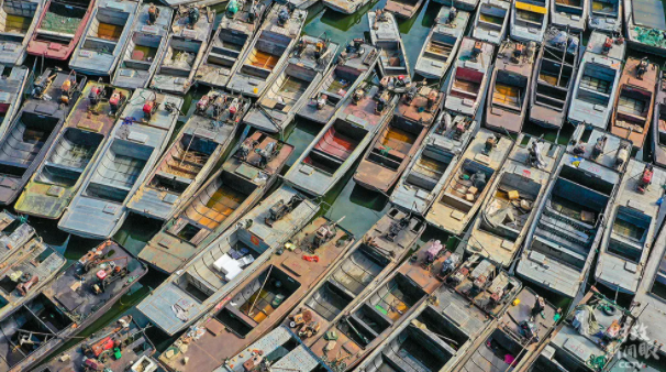 △國家實施長江流域禁捕退捕政策后,江蘇宿遷泗洪縣啟動洪澤湖水域禁捕退捕和住家船整治工作。這是聚集在漁港等待拆解的漁船。