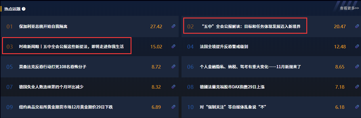 運用央視網(wǎng)“智聞”系統(tǒng)對30日全網(wǎng)新聞熱點進(jìn)行抓取,在熱點話題一欄,全會公報相關(guān)報道穩(wěn)居話題榜前列,相關(guān)報道也引起廣大網(wǎng)友的熱議。