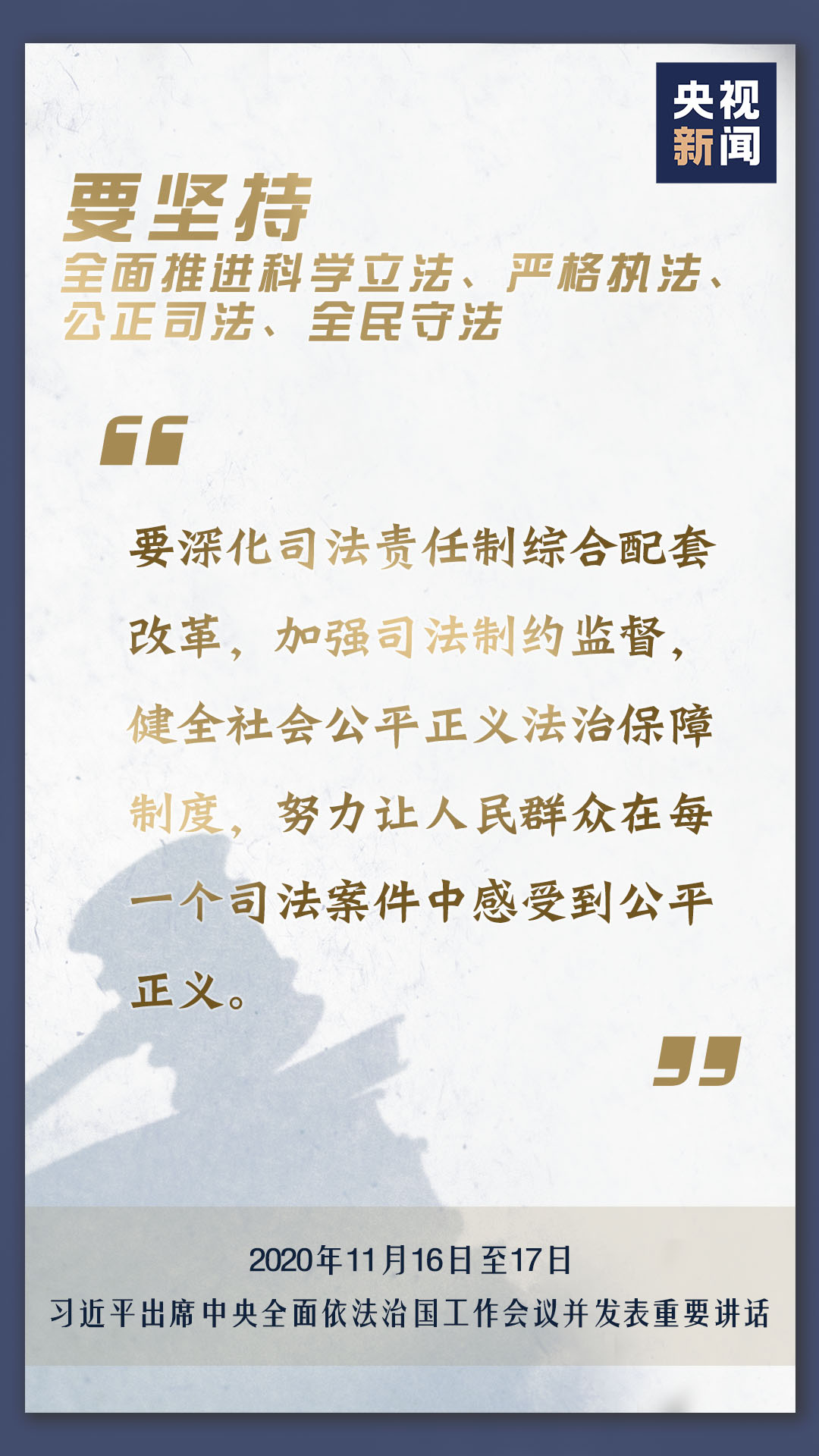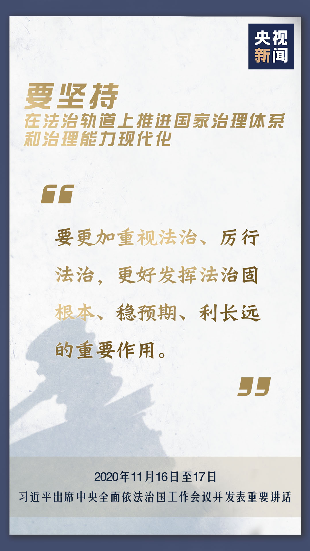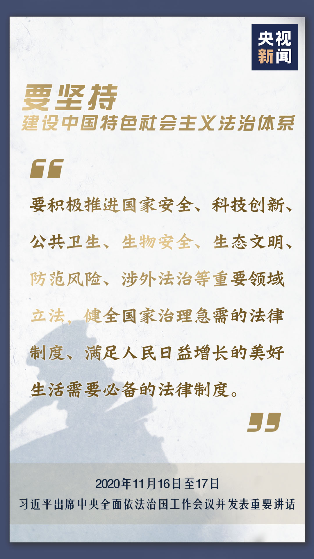中央全面依法治國工作會議11月16日至17日在北京召開,中共中央總書記、國家主席、中央軍委主席習(xí)近平出席會議并發(fā)表重要講話。會上,習(xí)近平對當(dāng)前和今后一個時期推進(jìn)全面依法治國要重點抓好的工作提出了11個方面的要求。