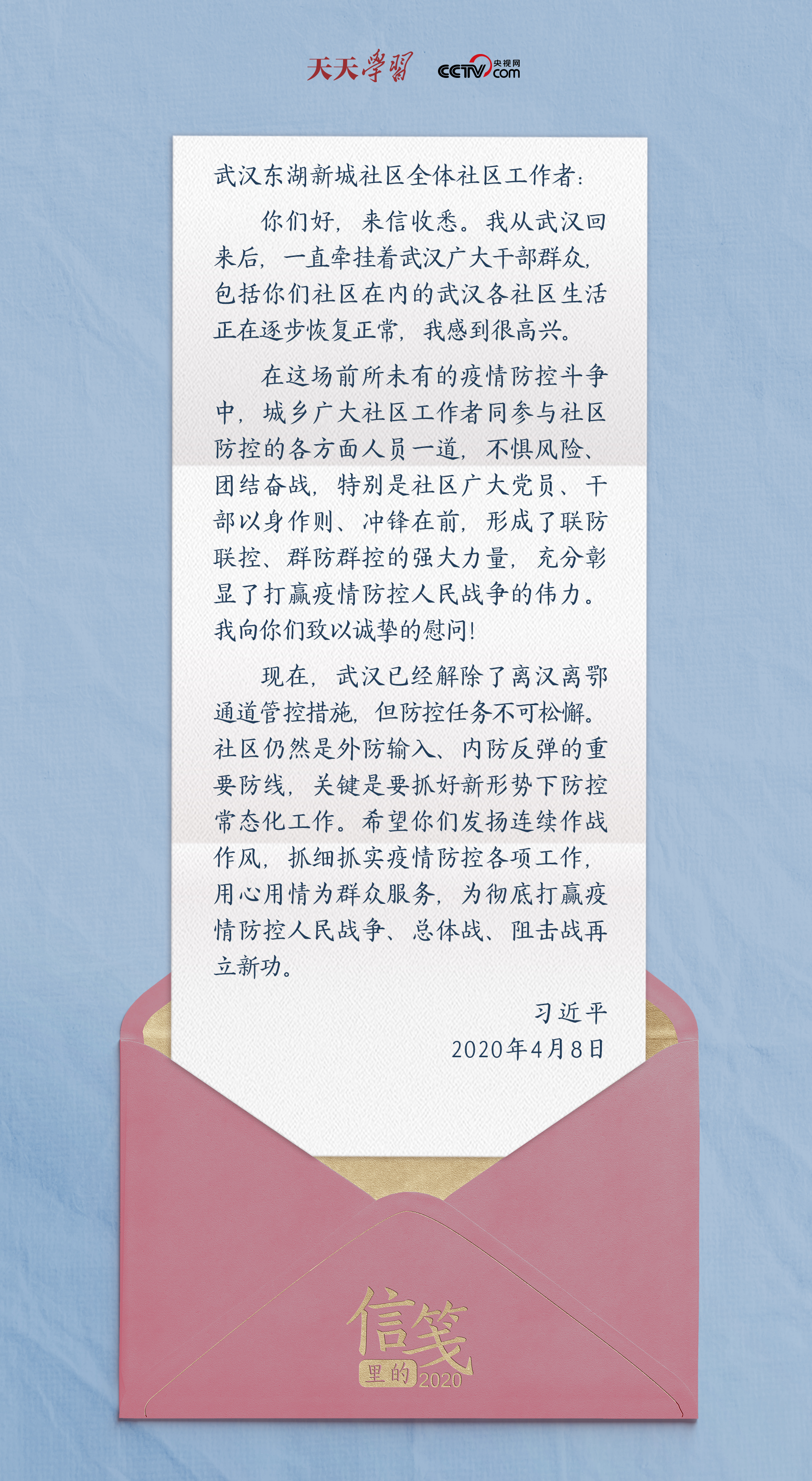 4月8日,武漢解封。在給武漢東湖新城社區(qū)全體社區(qū)工作者的回信中,總書(shū)記再次肯定城鄉(xiāng)廣大社區(qū)工作者在疫情防控斗爭(zhēng)中發(fā)揮的重要作用,并鼓勵(lì)他們“抓細(xì)抓實(shí)疫情防控各項(xiàng)工作,用心用情為群眾服務(wù)”,再立新功。