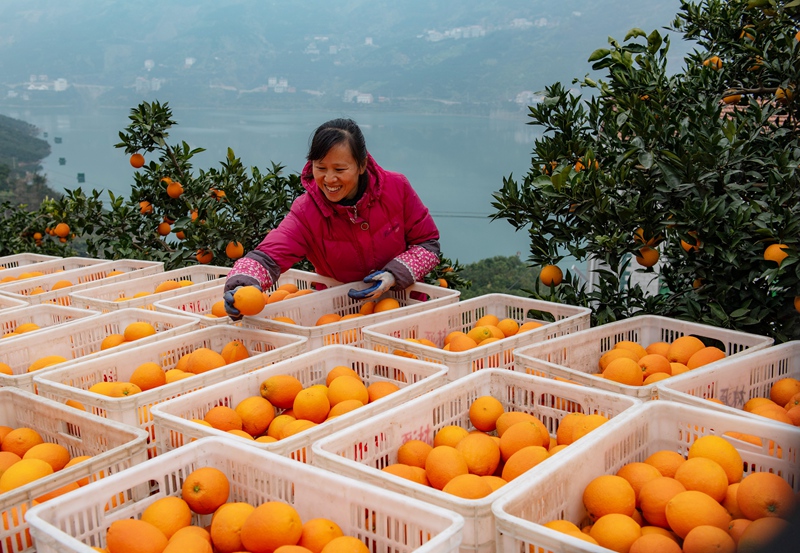 △2020年12月27日,湖北省秭歸縣水田壩鄉(xiāng)下壩村村民在整理即將出售的臍橙。