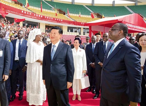 2018年7月22日,國(guó)家主席習(xí)近平在達(dá)喀爾同塞內(nèi)加爾總統(tǒng)薩勒共同出席塞內(nèi)加爾競(jìng)技摔跤場(chǎng)項(xiàng)目移交儀式。新華社記者? 王曄攝