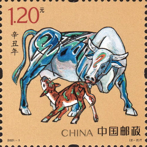 兩枚郵票分別展示了國家的期許、家庭的企盼,組合而成濃濃的新春祝福。其中,第一枚“奮發圖強”,描繪了雄壯有力、一往無前的奔牛形象,公牛四蹄揚起,昂首向前,目光炯炯,表達出不畏艱險、砥礪前行,為實現中華民族偉大復興而努力奮斗的寓意;第二枚“牛年大吉”,通過大牛與小牛舐犢情深的溫馨畫面,向全國人民傳遞家庭興旺和諧、團圓美滿的美好祝愿。