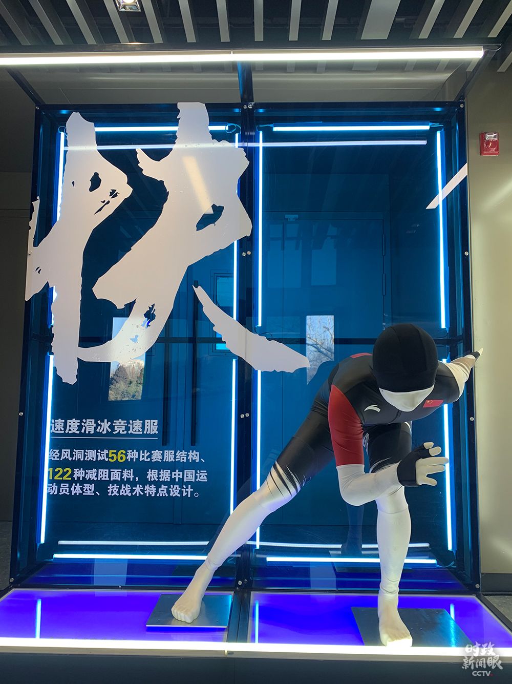 △首都體育館內(nèi)展示了多款訓練服,體現(xiàn)“快護暖美”的設(shè)計理念。這是速度滑冰競速服,經(jīng)風洞測試56種比賽服結(jié)構(gòu)、122種減阻面料,根據(jù)中國運動員體型、技戰(zhàn)術(shù)特點設(shè)計而成。(總臺央視記者范一鳴拍攝)