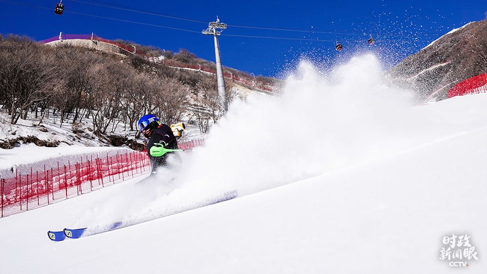 △中國高山滑雪隊隊員王基森在比賽地進行回轉(zhuǎn)訓練。(總臺國廣記者李晉拍攝)