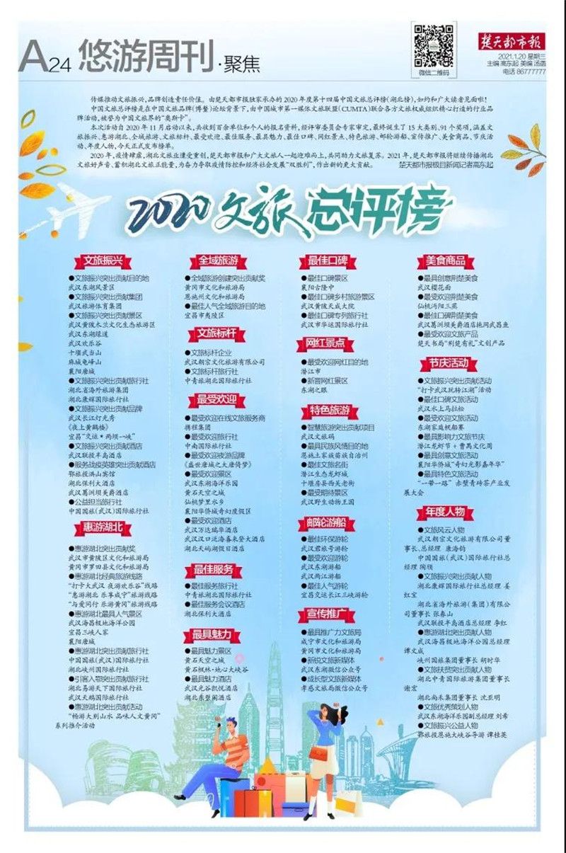 據(jù)悉,本次活動(dòng)自2020年11月啟動(dòng)以來,共收到百余單位和個(gè)人的報(bào)名資料,經(jīng)評(píng)審委員會(huì)專家審定 ,最終誕生了15大類別、91個(gè)獎(jiǎng)項(xiàng),涵蓋文旅振興、惠游湖北、全域旅游、文旅標(biāo)桿、最受歡迎、最佳服務(wù)、最具魅力、最佳口碑、網(wǎng)紅景點(diǎn)、特色旅游、郵輪游船、宣傳推廣、美食商品、節(jié)慶活動(dòng)、年度人物。