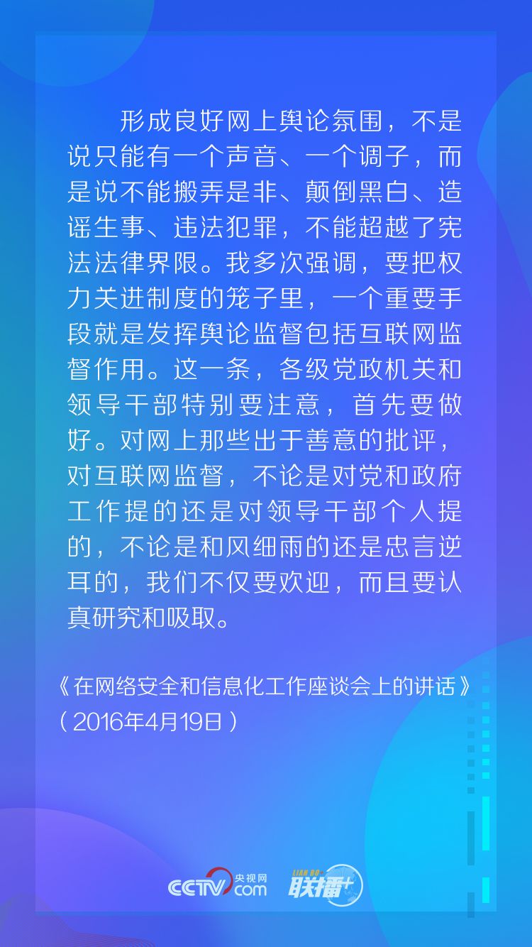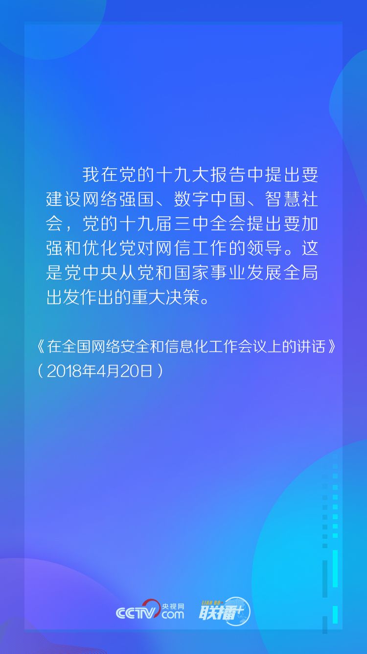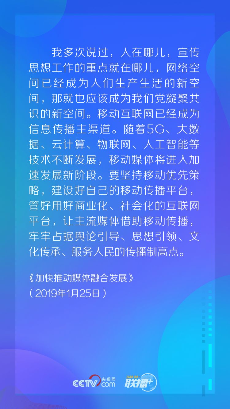 “我多次說過,人在哪兒,宣傳思想工作的重點(diǎn)就在哪兒,網(wǎng)絡(luò)空間已經(jīng)成為人們生產(chǎn)生活的新空間,那就也應(yīng)該成為我們黨凝聚共識的新空間。”