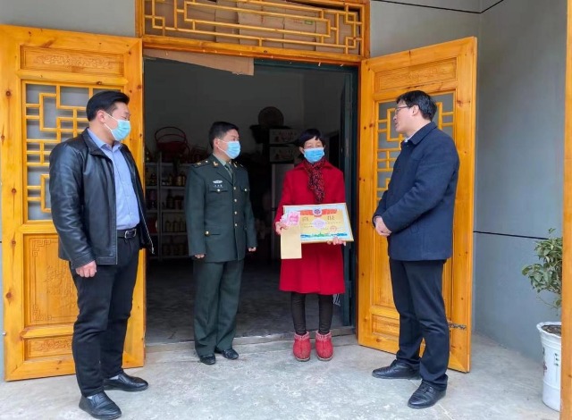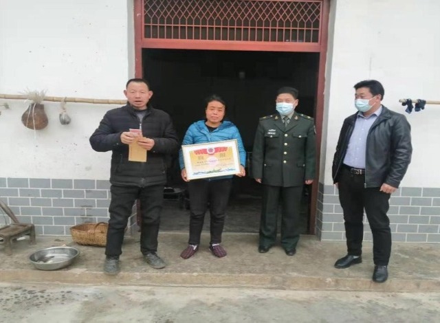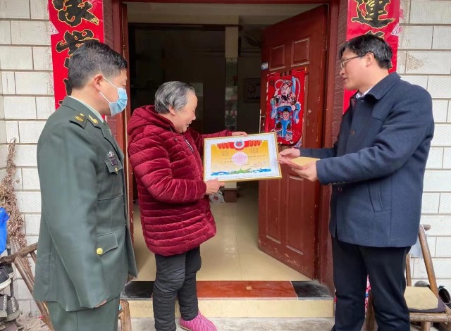 圖為鎮武裝部部長、退役軍人服務站站長與優秀義務兵家屬合影