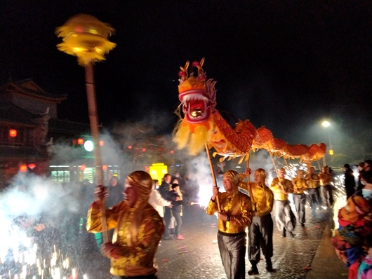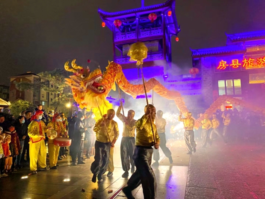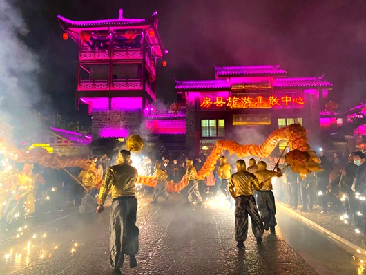 身著節(jié)日盛裝的民俗表演隊(duì)正在表演房縣的傳龍民俗—舞火龍,市民紛紛駐足圍觀。