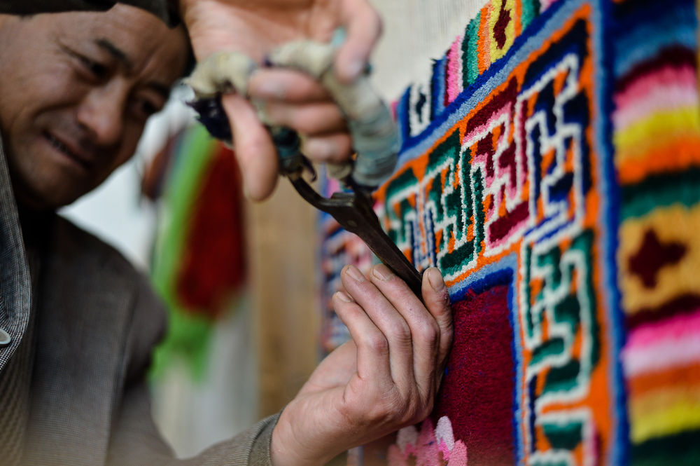 從8歲起就跟著父親洗毛、捻線的加牙藏毯國家級(jí)非物質(zhì)文化遺產(chǎn)傳承人楊永良,2013年在政府支持下成為“加牙藏族織毯技藝傳習(xí)所”的***。