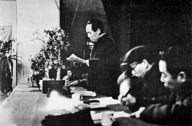 1945年4月,中共七大在延安召開。圖為毛澤東在大會上作政治報告。中共七大將毛澤東思想確立為黨的一切工作的指針