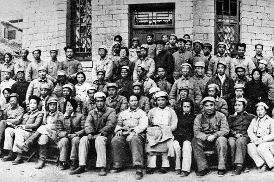 1942年5月,中共中央召開延安文藝座談會。圖為毛澤東、朱德(前排右三)等與參會部分代表在楊家嶺合影