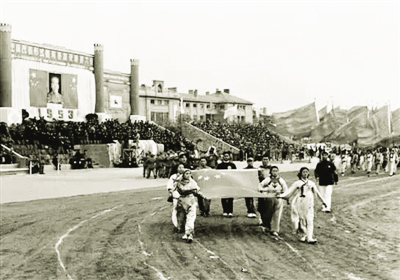 1953年11月,全國民族形式體育表演及競賽大會在天津舉行。圖為運動會入場式