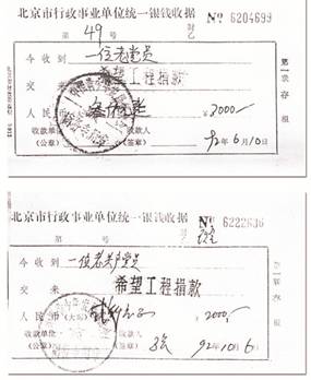鄧小平以“一位老共產黨員”的名義兩次共向希望工程捐款5000元。圖為捐款后的收據