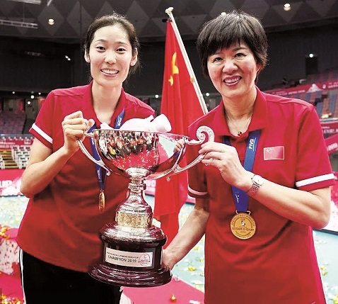 女排主教練郎平(右)和隊員朱婷合影