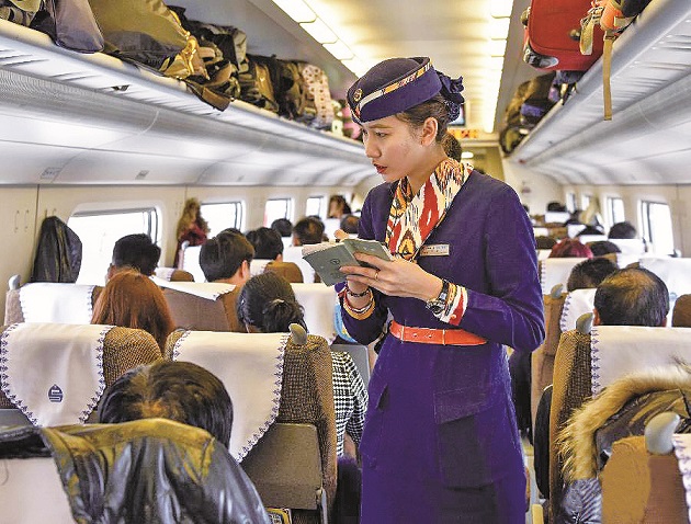 高鐵列車員正在核對乘客的票務信息