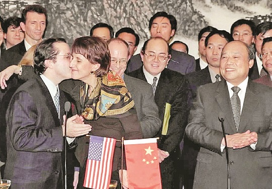 1999年11月15日,中美雙方在北京就中國加入世貿組織達成協議,取得了雙贏的成果。圖為美國國家經濟顧問斯珀林與巴爾舍夫斯基親吻,以祝賀談判成功和協議簽署。前排右一為中國外經貿部部長石廣生