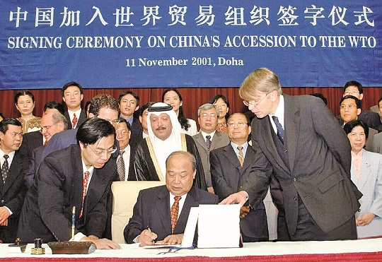 2001年11月10日下午,世界貿易組織第四屆部長級會議在卡塔爾首都多哈以全體協商一致的方式,審議并通過了中國加入世貿組織的決定。11日,時任中國外經貿部部長的石廣生在多哈簽署了中國加入世界貿易組織議定書。12月11日,中國正式加入世界貿易組織,成為其第143個成員。至此,經過15年的艱苦努力,中國終于叩開了世貿組織的大門。中央對復關和入世形勢的分析、作出的決策及對時機的把握,始終是正確的,這是中國成功入世的關鍵。