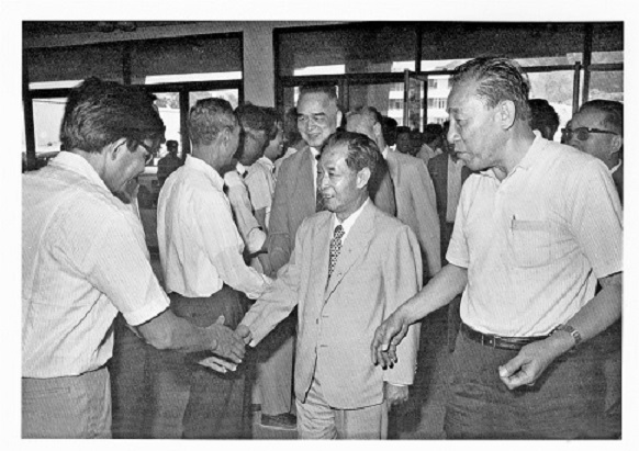 1984年5月23日,胡耀邦到深圳考察。考察期間,他為深圳書寫了“特事特辦、新事新辦;立場不變、方法全新”的題詞。圖為胡耀邦(前排右二)會見蛇口工業區的干部職工