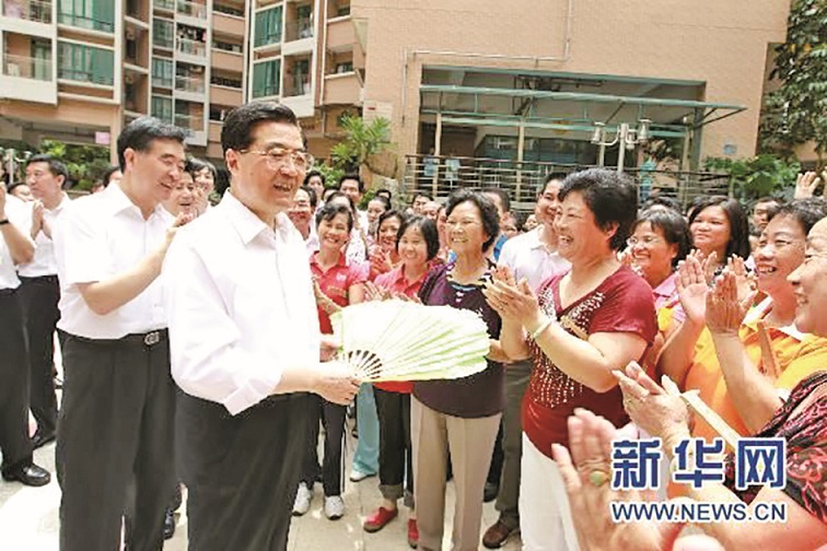 2010年9月4日至6日,胡錦濤在廣東省考察工作。圖為胡錦濤在深圳羅湖區南湖街道漁民村社區文化廣場,同正在舞扇子健身的居民們熱情攀談