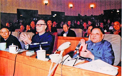 鄧小平、聶榮臻、王震(前排從右至左)到國防科工委指揮所觀看“東風五號”洲際導彈發射