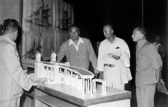 1960年6月,陳云、呂正操、朱德(從右至左)在上海觀看南京長江大橋的模型