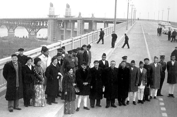 1973年12月,徐向前(前排左三)陪同尼泊爾國王和王后參觀南京長江大橋