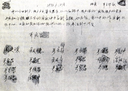 1978年12月,鳳陽縣小崗村18戶農民冒著政治風險,秘密在一份合同書上按下21個手印,自發搞起了“大包干”。圖為小崗村農民簽訂的合同書