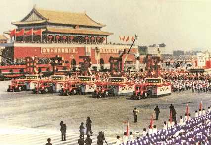 1984年國慶游行時,拖拉機載著“聯產承包好”的牌子通過天安門廣場