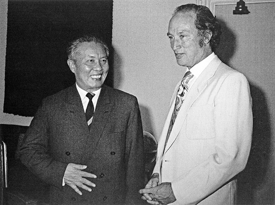 1973年10月10日,特魯多帶著精心準備的禮物——白求恩大夫發明的肋骨剪,首次以總理身份訪華。他受到中方高規格接待,周恩來總理3次與他會晤,還陪他訪問洛陽,并在火車上與他徹夜長談。鄧小平副總理則陪他觀看了《紅色娘子軍》,并同他一起游覽桂林。特魯多以“不遠萬里”來形容自己的中國之行,稱妨礙兩國間相互了解的不是高山、森林和大海,而是“頭腦中的冥頑不靈”。他說:“建設一個國家需要兩種旅行者,一種是克服地理上距離的,另一種是克服思想上和精神上距離的,而我同時成了這兩種旅行者。”