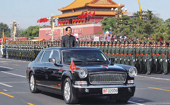 2009年10月1日,在國慶60周年閱兵式上,胡錦濤乘坐紅旗轎車檢閱部隊