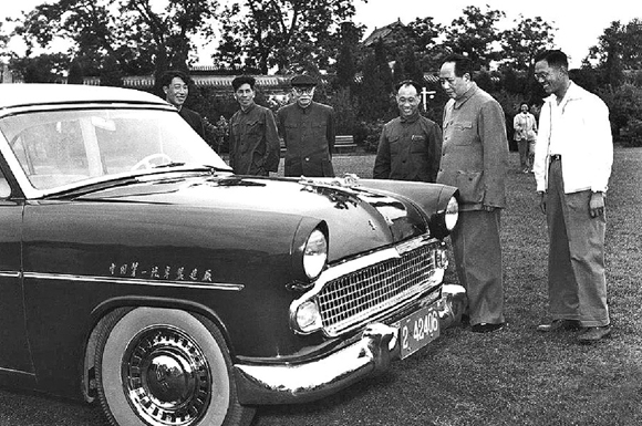 1958年5月21日下午,毛澤東在中南海懷仁堂后花園,觀看國產的第一輛東風轎車(紅旗轎車的前身