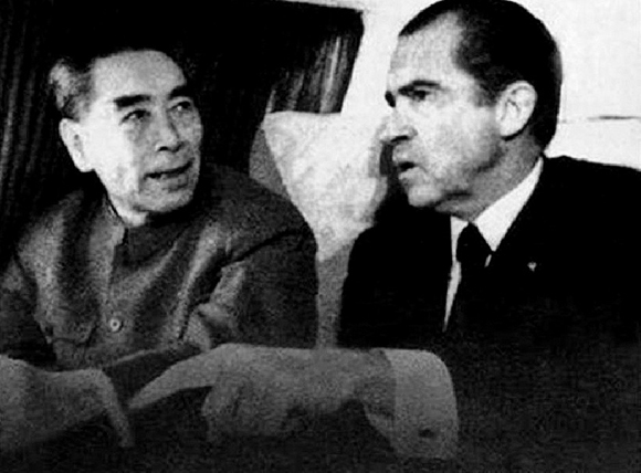 1972年,美國總統尼克松訪華,周恩來率紅旗轎車國賓車隊到機場迎接。圖為周恩來和尼克松在紅旗轎車內交談