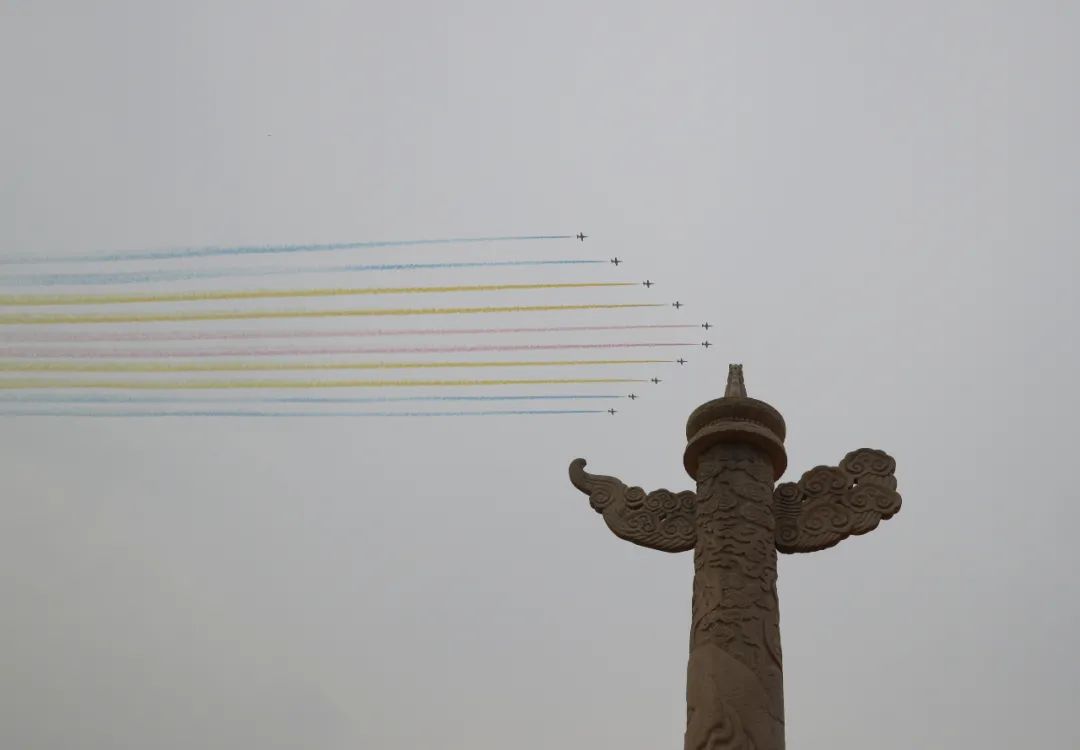 空中護(hù)旗梯隊(duì)拉開(kāi)飛行慶祝表演序幕