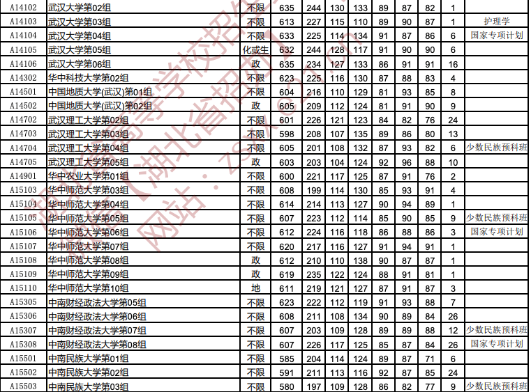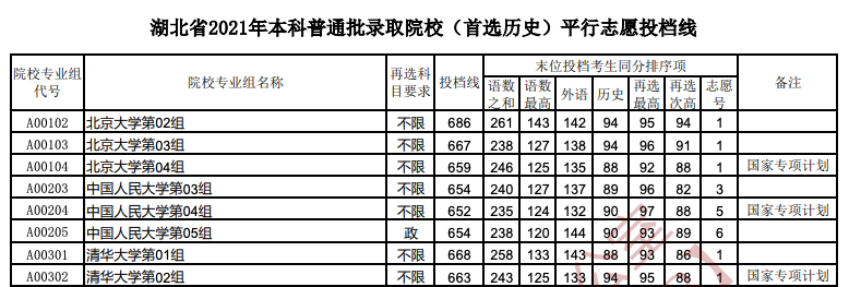 湖北省2021年本科普通批錄取院校(首選歷史)平行志愿投檔線