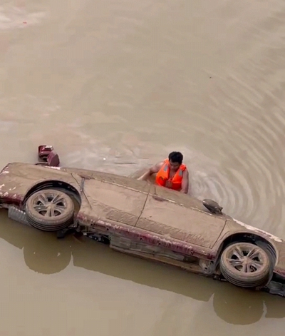 袁格兵說,在7月21日下午的一次救援中,他發(fā)現(xiàn)兩人被困,一個被困在車頂、一個被困在路邊的電線桿處,當(dāng)時他距離兩人僅僅七八米遠。可就在袁格兵奮力游向他們時,由于水流太過湍急,袁格兵被水流沖到距離兩人200多米的位置才慢慢穩(wěn)住。