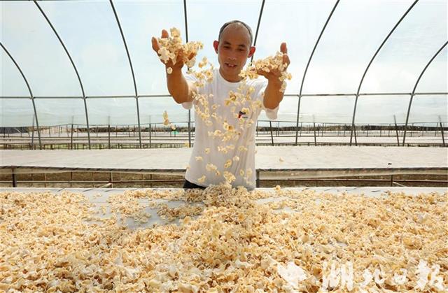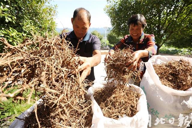 圖為房縣軍店鎮(zhèn)三溪溝村農(nóng)民在神農(nóng)本草中藥材基地裝包曬干的北柴胡。