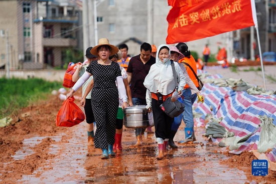 來自武警江西省總隊(duì)機(jī)動支隊(duì)的官兵與當(dāng)?shù)馗刹?、村民一起連續(xù)奮戰(zhàn),用沙袋和土石在昌江堤上壘起了一道一米多高、三公里長的臨時(shí)防水墻。新華社記者 周密 攝